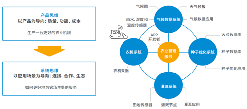 约翰·迪尔通过农机设备上的传感器收集数据,将收集到的设备数据和气象、土壤、种子等数据结合在一起,利用分析技术帮助农场主做出更为科学的农耕决策。约翰·迪尔整合了来自不同产业领域的数据和知识,同时myJohn Deer平台还提供了API接口,便于外部的开发者更好地利用这些数据。